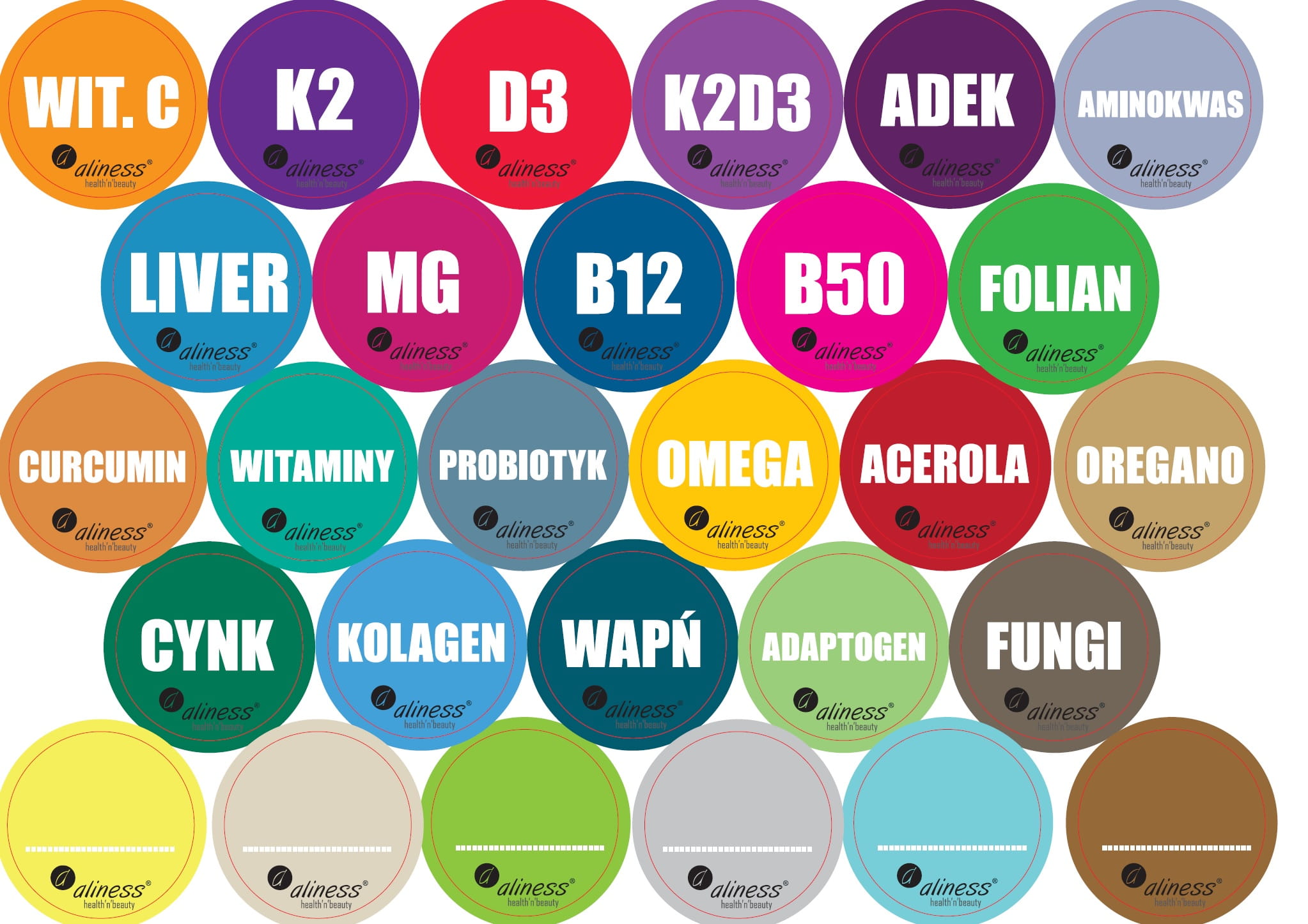Praktyczny zestaw naklejek, który pozwala uporządkować Twoje suplementy Aliness i szybko odnaleźć potrzebny produkt. W komplecie znajdują się zarówno naklejki z nazwami najpopularniejszych suplementów, jak i puste etykiety, które możesz uzupełnić własnymi opisami.
